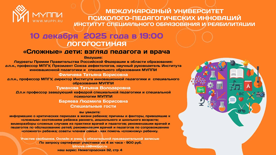 Филичева Татьяна Борисовна - д.п.н. профессор Президент Союза дефектологов, научный руководитель Института инновационной педагогики и специального образования.